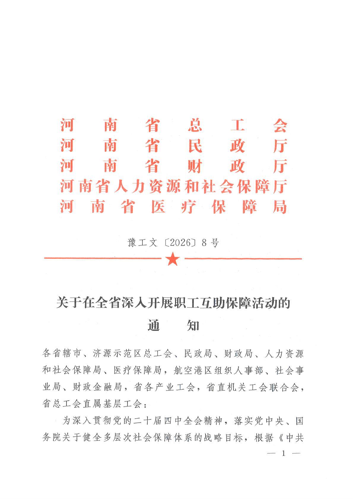 豫工办〔2026〕8号:关于在全省深入开展职工互助保障活动的通知